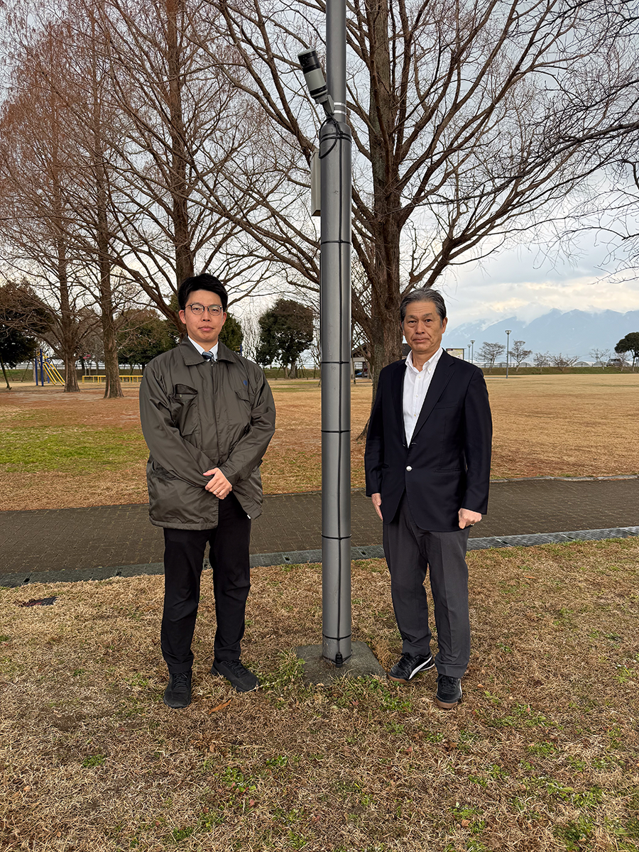 公園内の照明灯に設置されたカメラ・通信ユニット・水位センサーは、水位の変化を検知するだけでなく、周囲の状況を画像で捉えることが可能です。「数値情報」に「視覚情報」を加えることで、水の広がり方や現場の状況をリアルタイムに把握できる点が、本システム独自の強みとなっています。