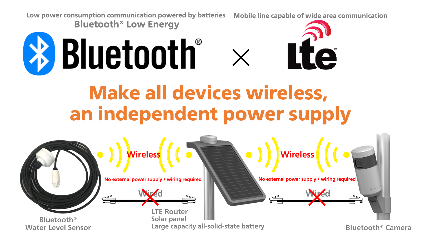 | Solar battery integrated router | LTE communication unit, solar panel, large capacity all-solid-state battery |