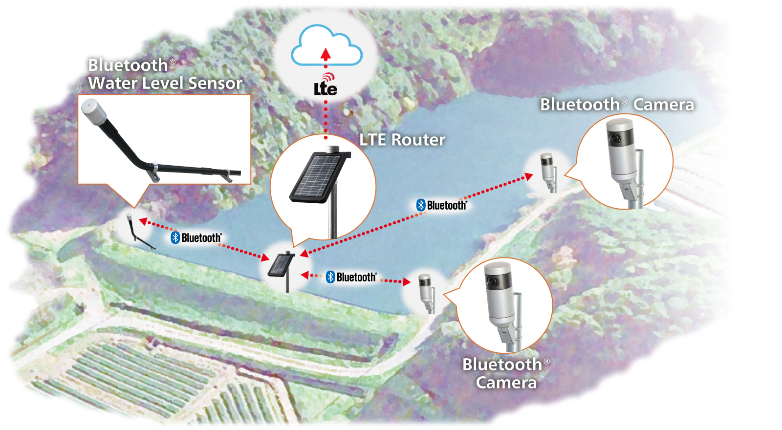 With Long Range mode of Bluetooth®︎ LE, water level sensor/camera and LTE communication unit (LTE router) are separated into a wireless network. Data is aggregated in the LTE router sent to and received from cloud, achieving low communication costs and high connectivity. LTE router has a completely independent structure that integrates a solar panel and a large-capacity solid-state battery. Bluetooth®︎ water level sensor and Bluetooth®︎ camera both adopt a long-life battery drive. Since no external power supply or wiring is required, all devices can be installed independently at the optimum location. Additional installation of Bluetooth®︎ water level sensors and Bluetooth®︎ cameras are also possible with ease.